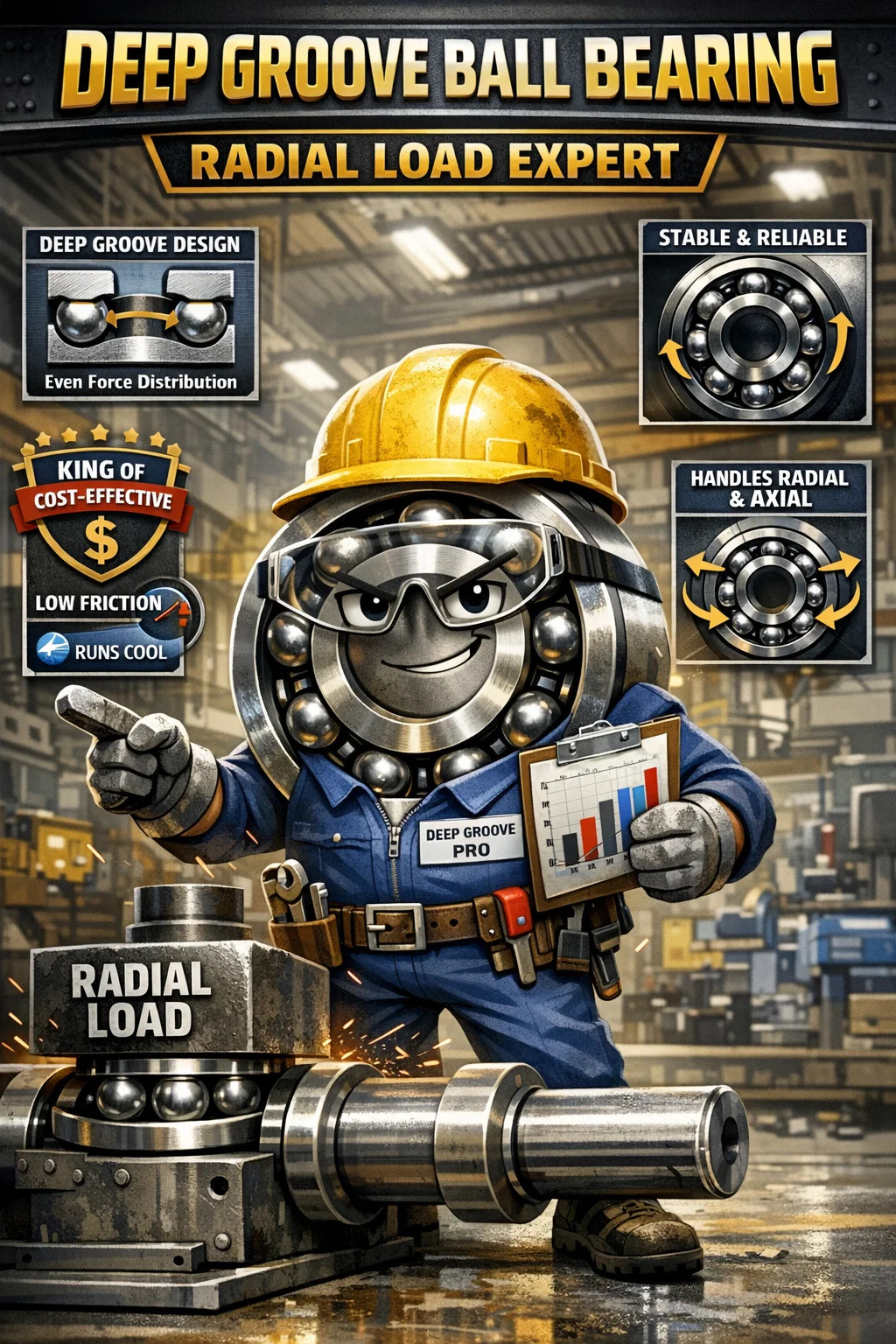 Přestože jeho hlavním úkolem je odolávat radiálním silám, díky hloubce „hluboké drážky“ zvládne i určitou axiální sílu (sílu tlačí hřídel ze strany na stranu). Tato schopnost zvládat radiální i axiální zatížení z něj dělá dnes nejpoužívanější ložisko na světě.