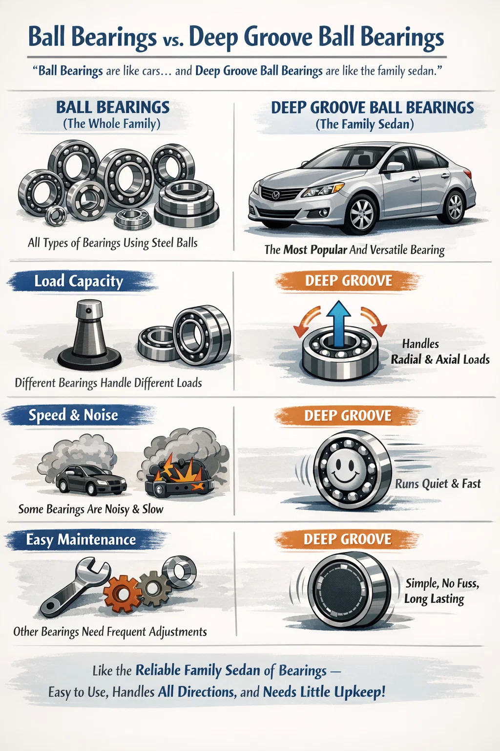 Kuličková ložiska si můžete představit jako „auta“ a kuličková ložiska s hlubokou drážkou jako nejběžnější „rodinný sedan“.